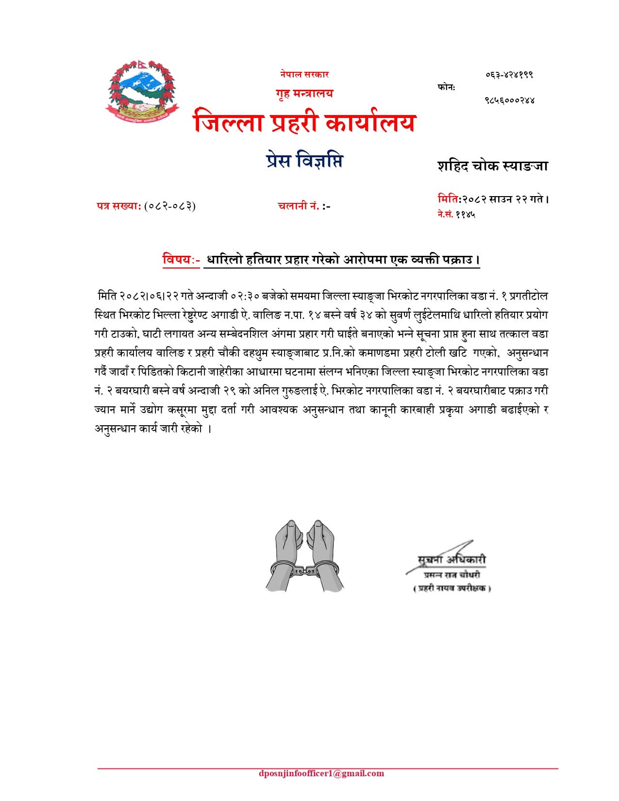 भिर्कोटमा धारिलो हतियार प्रहारः अनिल गुरुङ प्रहरी नियन्त्रणमा, सुवर्ण लुइटेलको चरकको आईसीयूमा उपचार