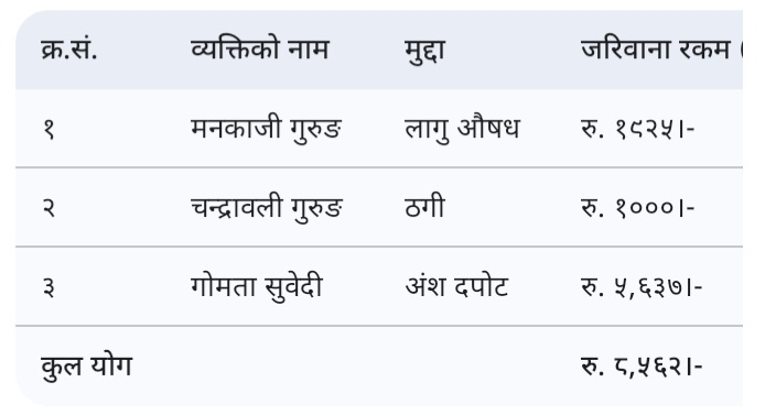 जिल्ला प्रहरी कार्यालय, स्याङ्जाद्वारा पक्राउ गरिएका चार जना फरार कसूरदारहरूबाट सम्मानित अदालतको फैसला अनुसार असुल गरिने जरिवाना रकमको कुल योग निम्नानुसार रहेको छ: