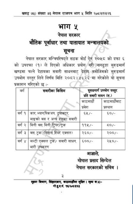 भौतिक पूर्वाधार तथा यातायात मन्त्रालयले हिजो राजपत्रमा सूचना प्रकाशित गर्दै सुरुङमार्ग प्रयोग गरेबापत तिर्नुपर्ने दस्तुर तोकेको हो । मन्त्रिपरिषद्ले सडक बोर्ड ऐन, २०५८ को दफा ६ को उपदफा (१) ले दिएको अधिकार प्रयोग गरी यो शुल्क निर्धारण गरेको हो ।